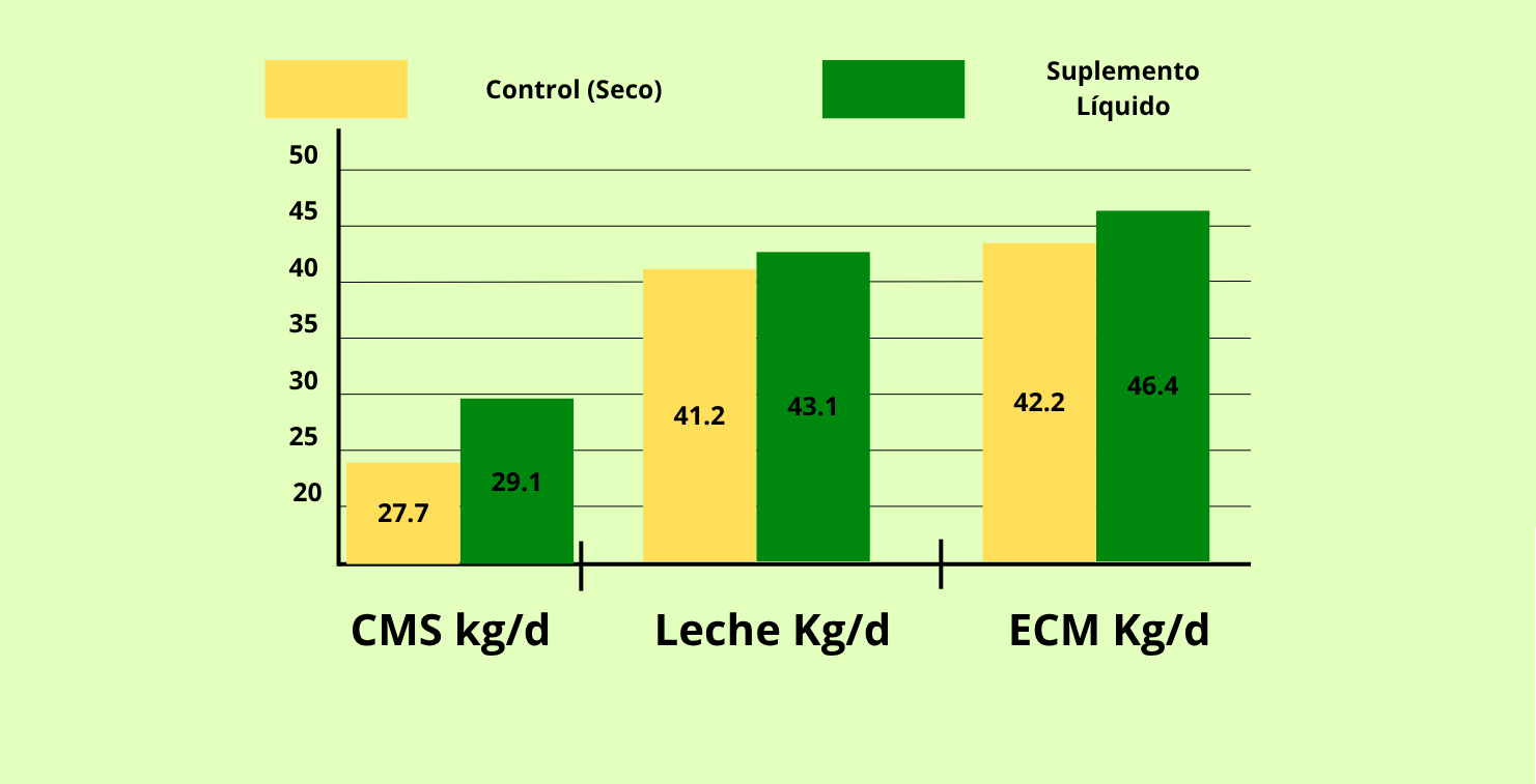 Utilizando un suplemento líquido en raciones para vacas lecheras en producción con un balance óptimo de proteínas degradables y carbohidratos en el rumen, ayuda a aumentar el consumo de materia seca y la producción de leche.